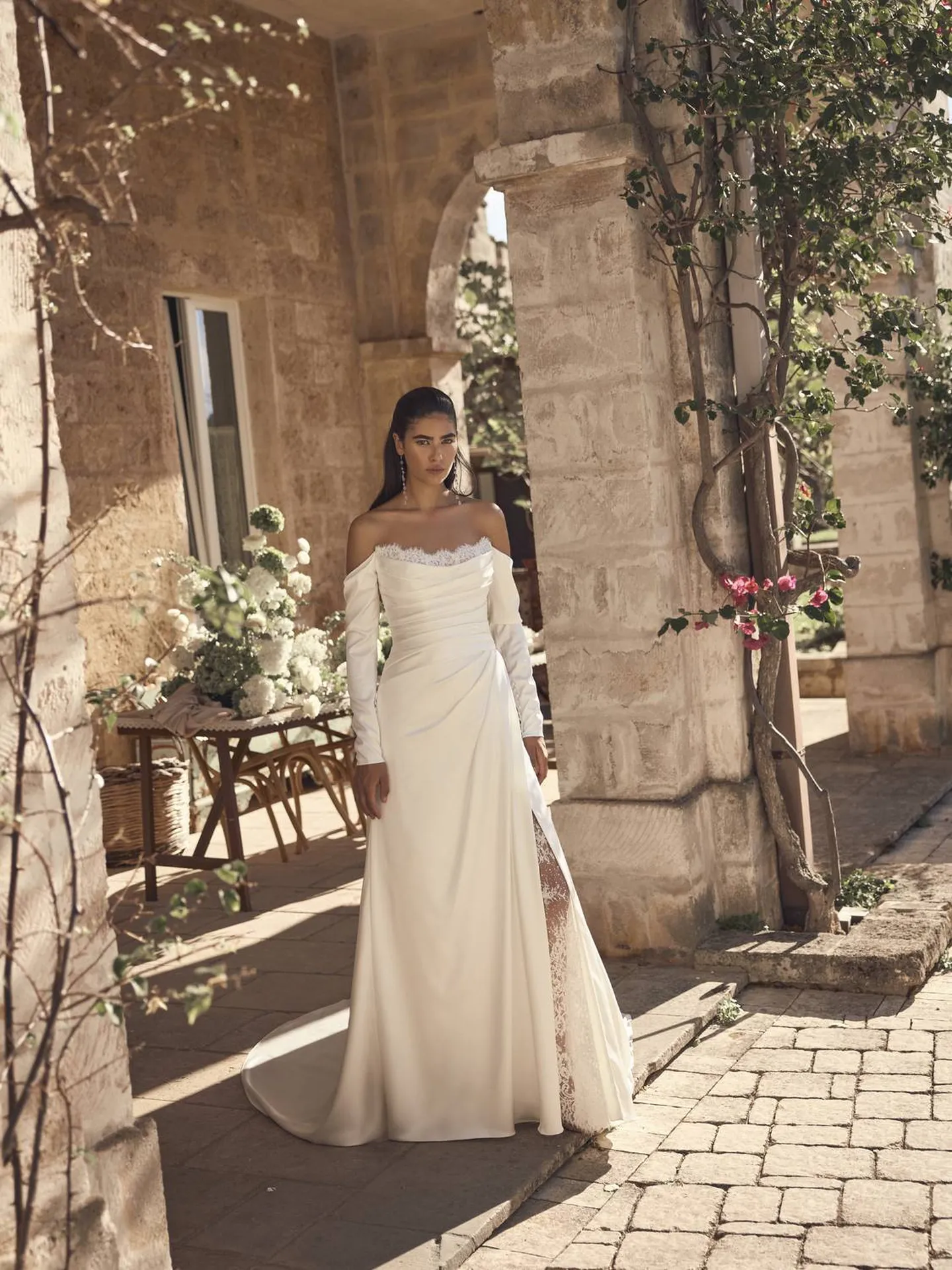 Elle évoque une féminité forte et assumée, tout en conservant une grande douceur. La combinaison du bustier structuré, du drapé délicat, des manches longues et de la fente en dentelle crée un équilibre parfait entre sensualité et sophistication. Chaque détail semble pensé pour sublimer la silhouette sans jamais la surcharger.