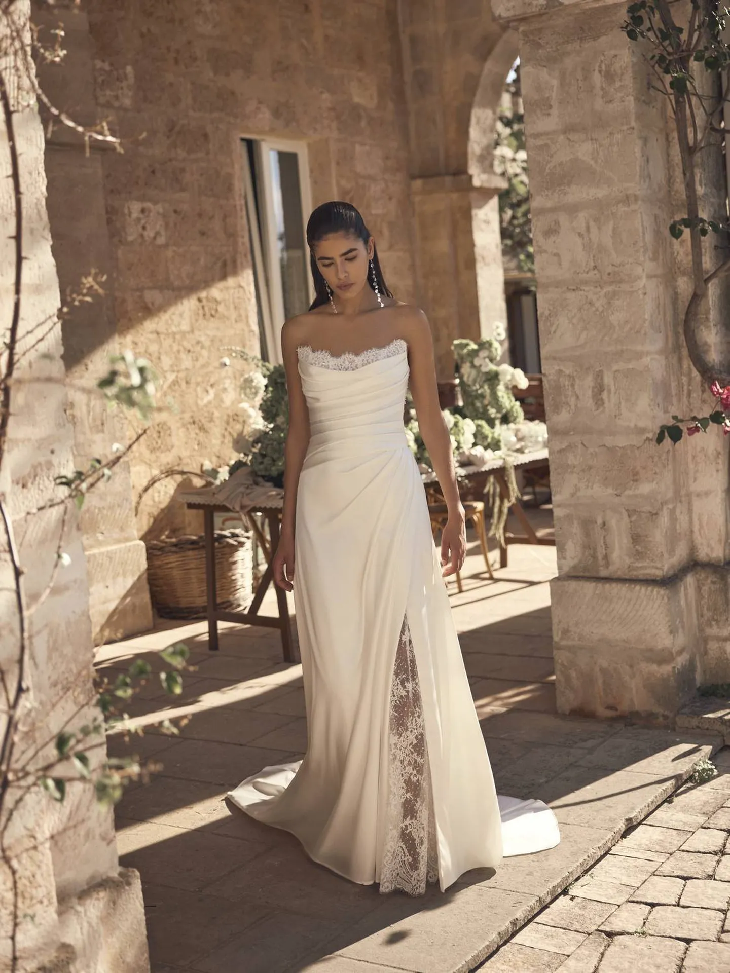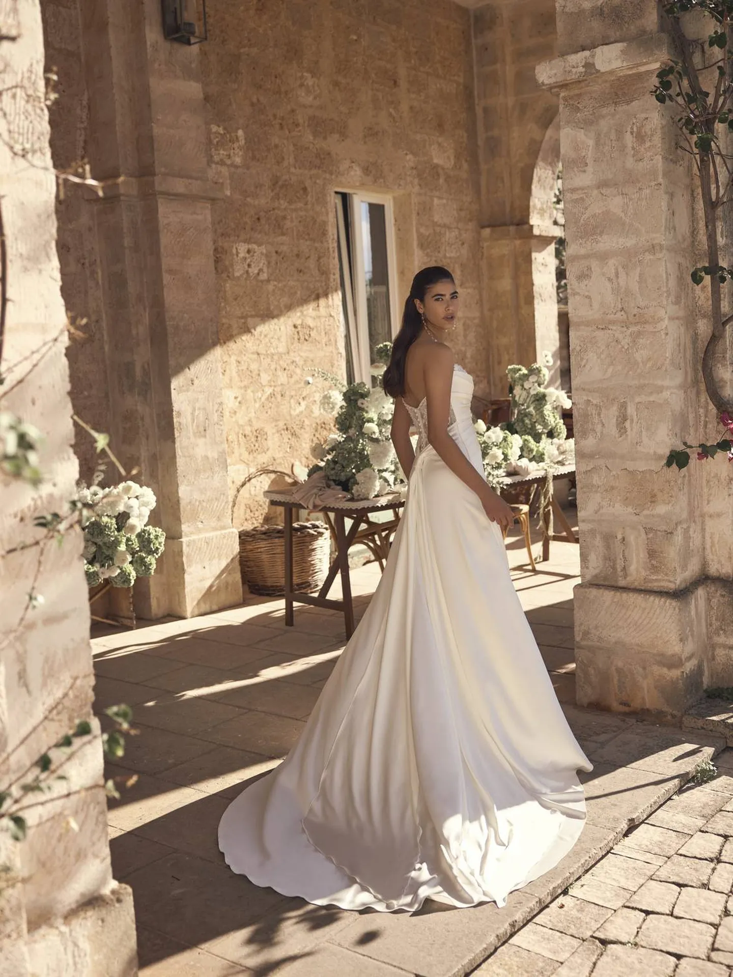 La couleur de la robe se situe dans un blanc ivoire chaud, légèrement satiné, qui capte la lumière avec douceur. Cette teinte met en valeur le drapé du tissu et accentue la richesse des textures, tout en restant naturelle et élégante. Elle s’accorde parfaitement avec un environnement lumineux et authentique, comme une architecture en pierre ou un cadre méditerranéen.