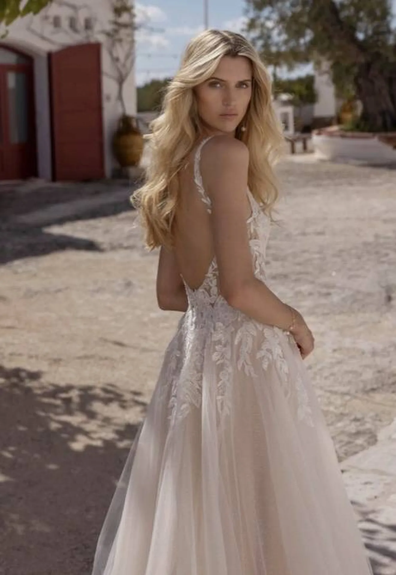 Cette robe de mariée se distingue par son élégance naturelle et son allure résolument romantique. Conçue pour sublimer la silhouette avec légèreté, elle séduit par l’équilibre parfait entre raffinement, modernité et douceur. Le corsage est délicatement orné de dentelle florale finement travaillée, créant un jeu subtil de transparence qui met en valeur le buste avec finesse et féminité. Les motifs floraux semblent se fondre dans la peau, apportant une sensation de légèreté et un rendu visuel aérien.