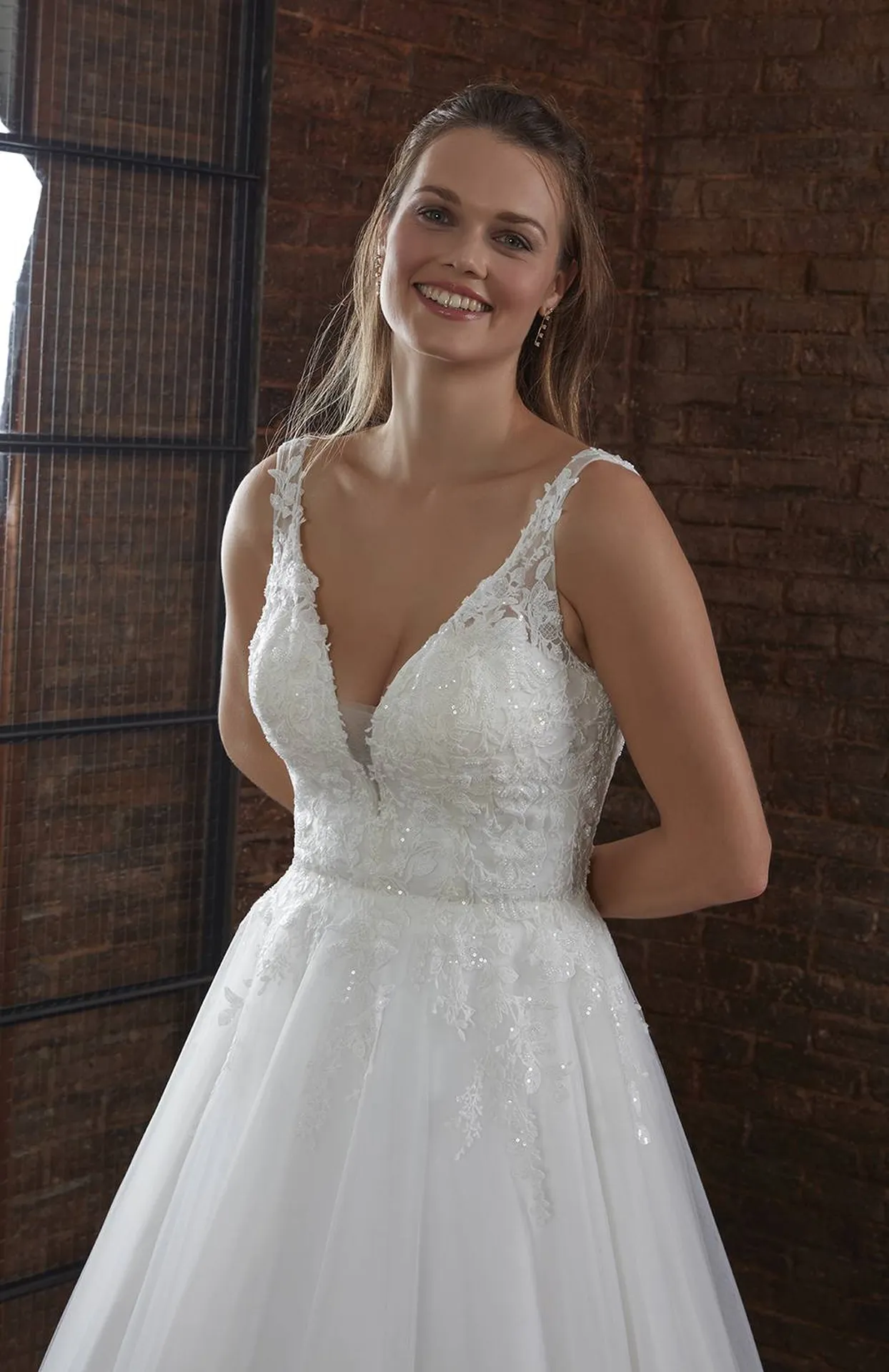Cette robe de mariée fusionne avec grâce le tulle délicat et la dentelle intemporelle. Son bustier dévoile un décolleté en "V" orné de dentelle perlée, rehaussé par des bretelles transparentes, apportant élégance et raffinement à ce modèle. Son dos délicatement travaillé en dentelle forme également un magnifique "V", offrant une touche romantique et délicate.