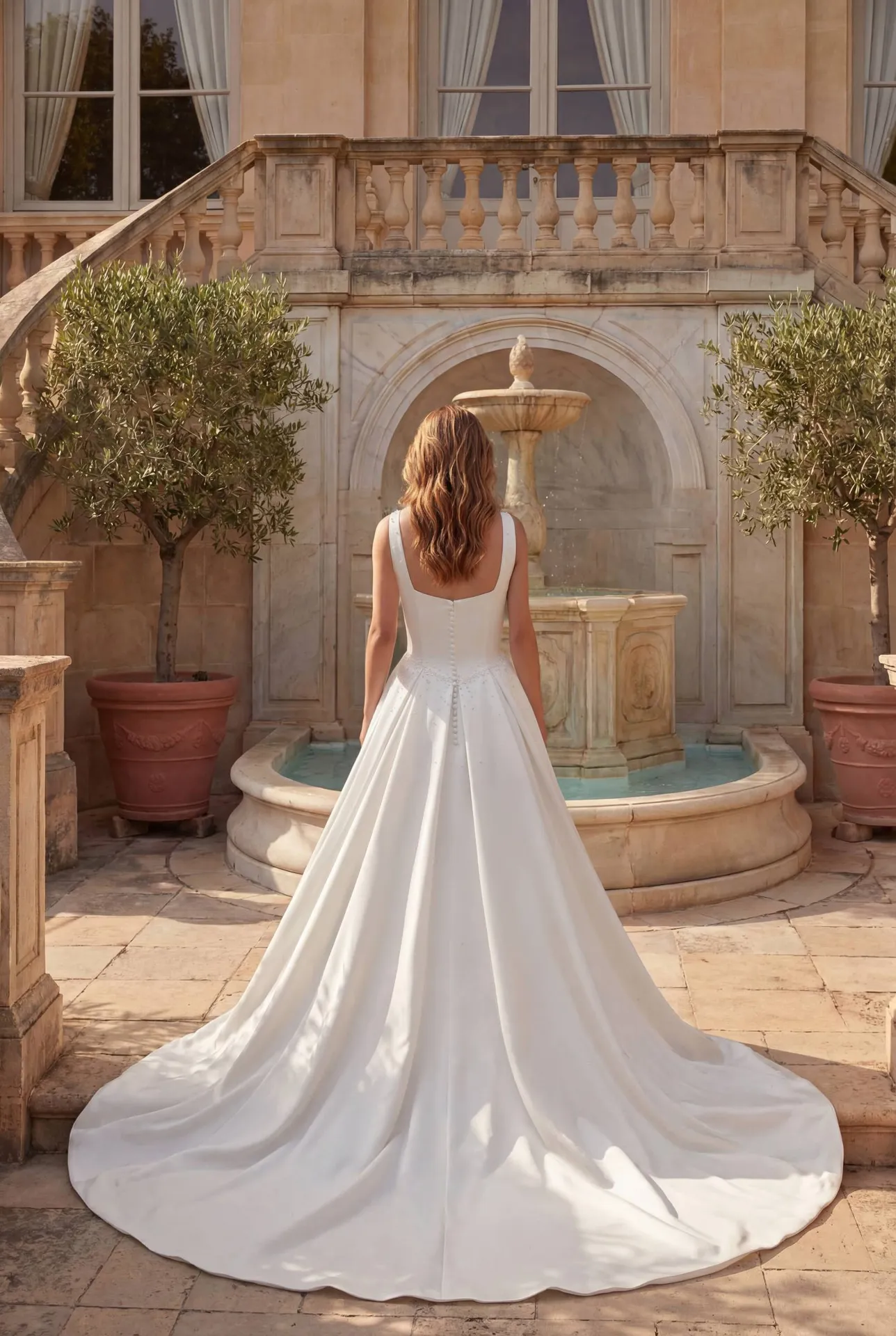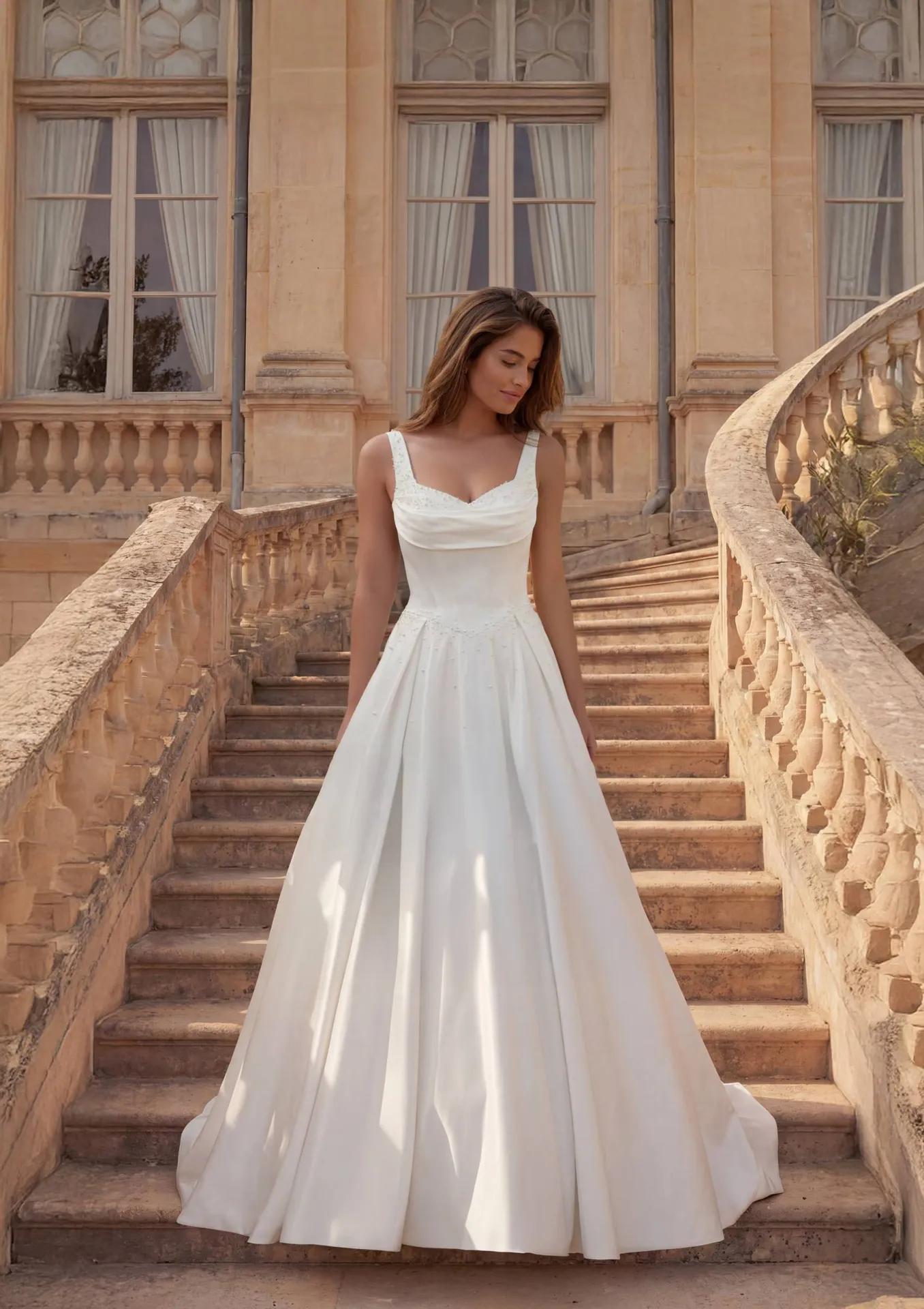 Cette robe de mariée en satin incarne une élégance pure et intemporelle, sublimée par une coupe structurée et des détails délicats qui lui confèrent un charme discret mais remarquable. Dès le premier regard, elle séduit par sa simplicité raffinée et son allure majestueuse, parfaitement mise en valeur dans un décor architectural lumineux et classique. Elle s’adresse à une mariée en quête d’un style épuré, mais avec une touche de sophistication subtile.