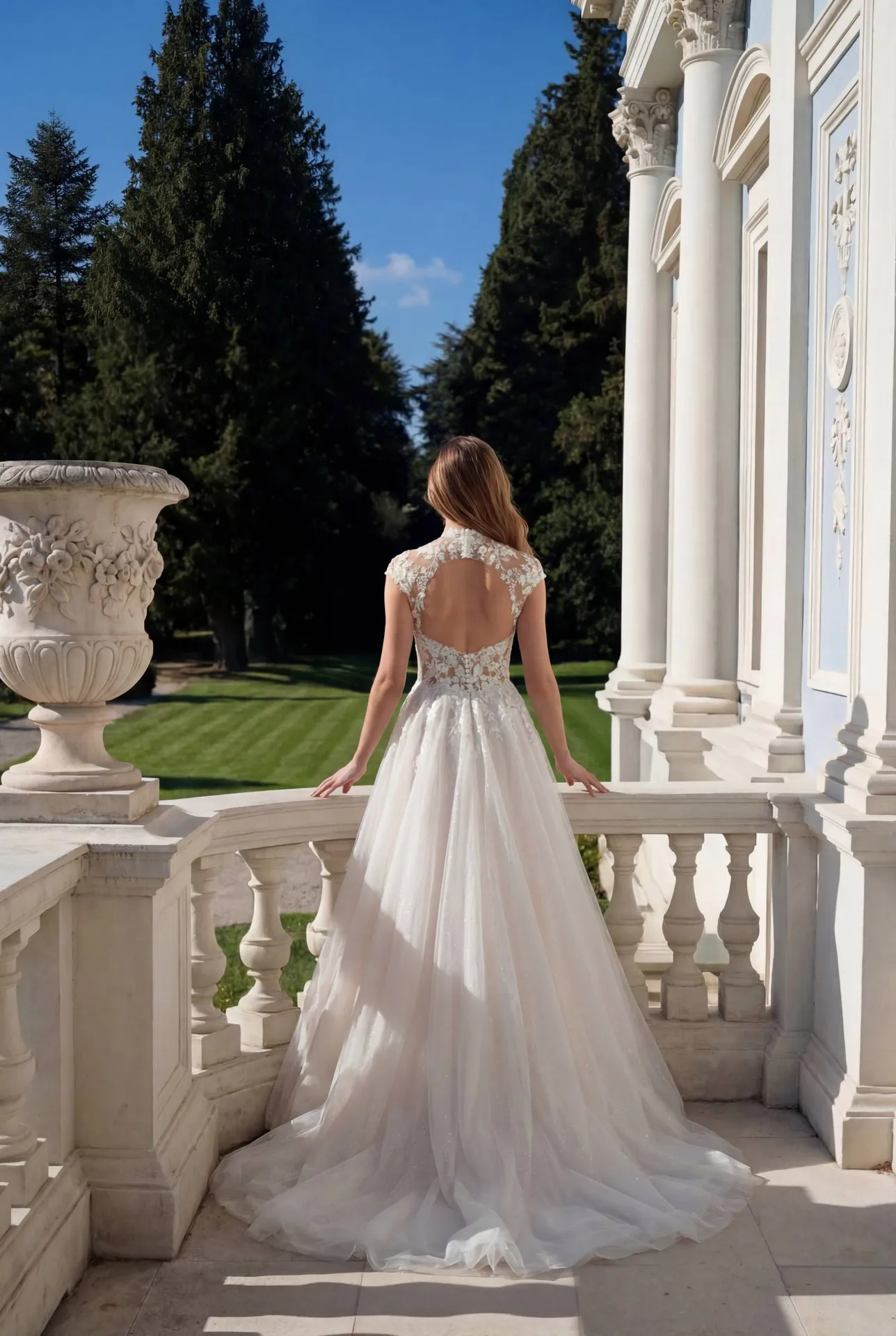 Dans un environnement extérieur comme celui présenté, cette robe révèle tout son potentiel. La lumière du jour met en valeur les transparences et les textures, tandis que le cadre naturel renforce son côté romantique. Elle s’intègre parfaitement dans un décor de jardin ou de lieu prestigieux, où l’élégance et la simplicité se rencontrent.