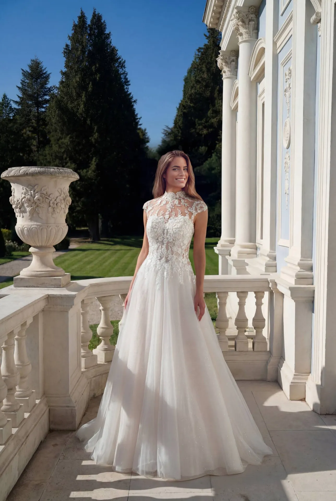 L’encolure haute, dans un esprit col illusion, apporte une touche de distinction et de modernité. Elle habille le haut du buste avec finesse et met en valeur le port de tête. Ce type d’encolure est particulièrement apprécié pour son élégance naturelle, offrant une alternative raffinée aux décolletés plus classiques. La dentelle semble se poser délicatement sur la peau, comme un voile brodé, renforçant l’effet de légèreté.