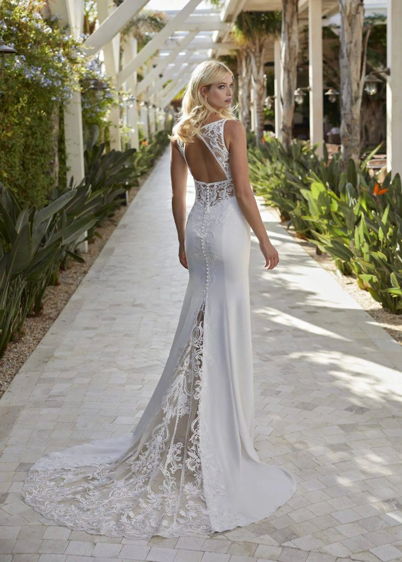 Démarquez-vous dans cette robe ajustée et évasée Naomi, dotée d’un séduisant corsage en dentelle transparente et d’un élégant décolleté en V. Le dos en trou de serrure vous donnera une allure époustouflante lors de votre passage à l’autel. La jupe élégante en crêpe est ajustée et s’évase en bas pour former une traîne en dentelle transparente de longueur chapelle.