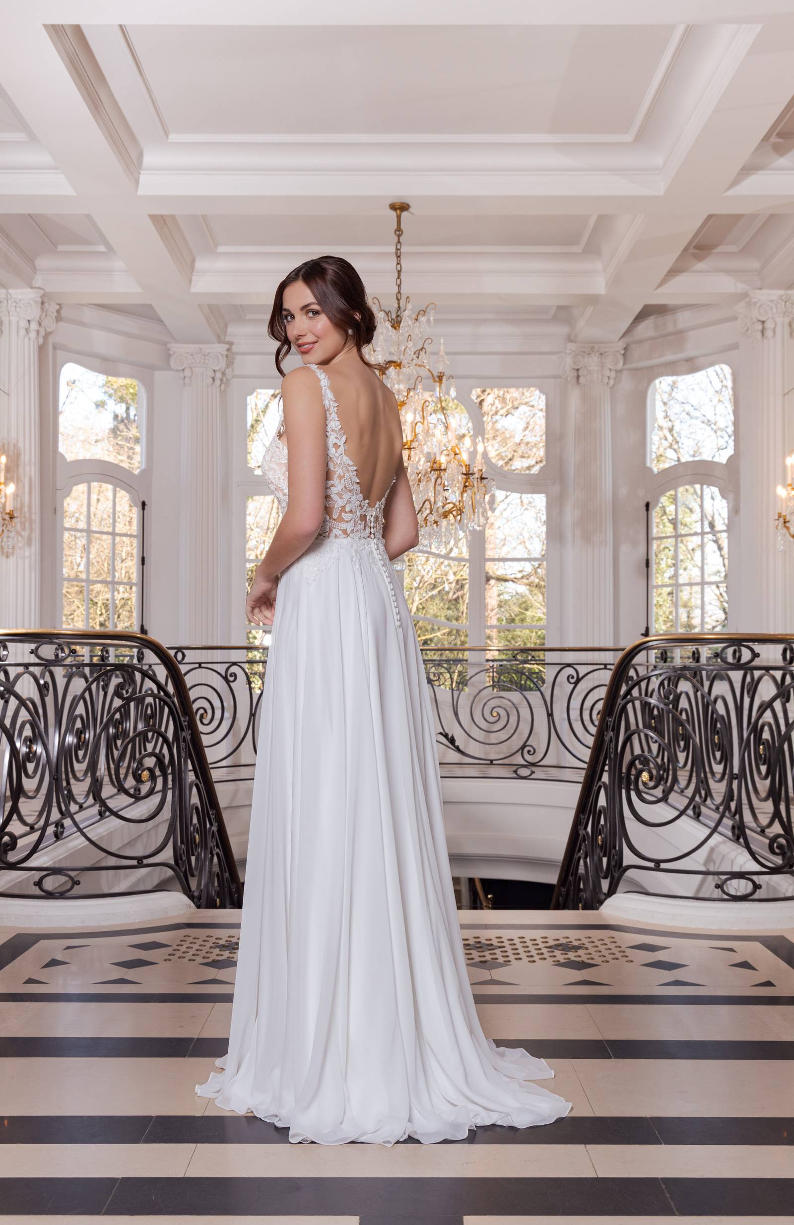 Le haut de la robe peut se présenter sous différentes formes selon le modèle choisi : un décolleté en V, un bustier romantique en dentelle, des bretelles fines ou un dos nu plongeant. Chaque détail est pensé pour sublimer la mariée en fonction de sa morphologie et de ses envies. Le travail des matières et les finitions délicates – que ce soit un dos en tulle brodé, des boutons nacrés ou un galon en dentelle – ajoutent à l’allure une touche de raffinement sans excès.