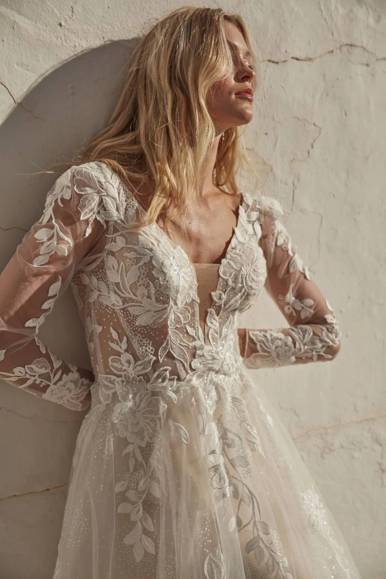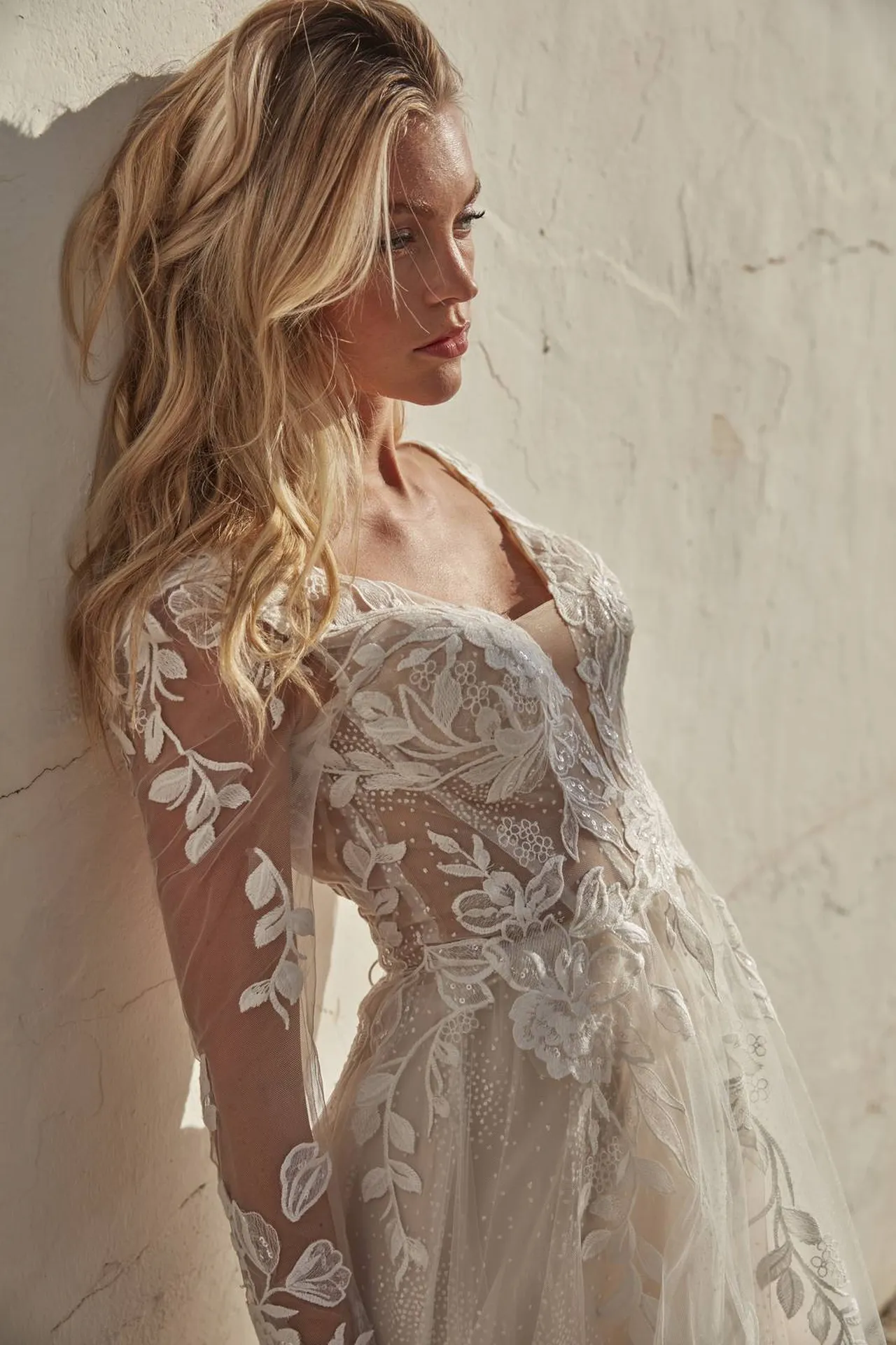 La robe bohème à manches longues est une ode à la liberté, à la féminité et au romantisme naturel. Conçue pour les mariées en quête d’authenticité et de douceur, elle se distingue par ses lignes aériennes et son charme intemporel.