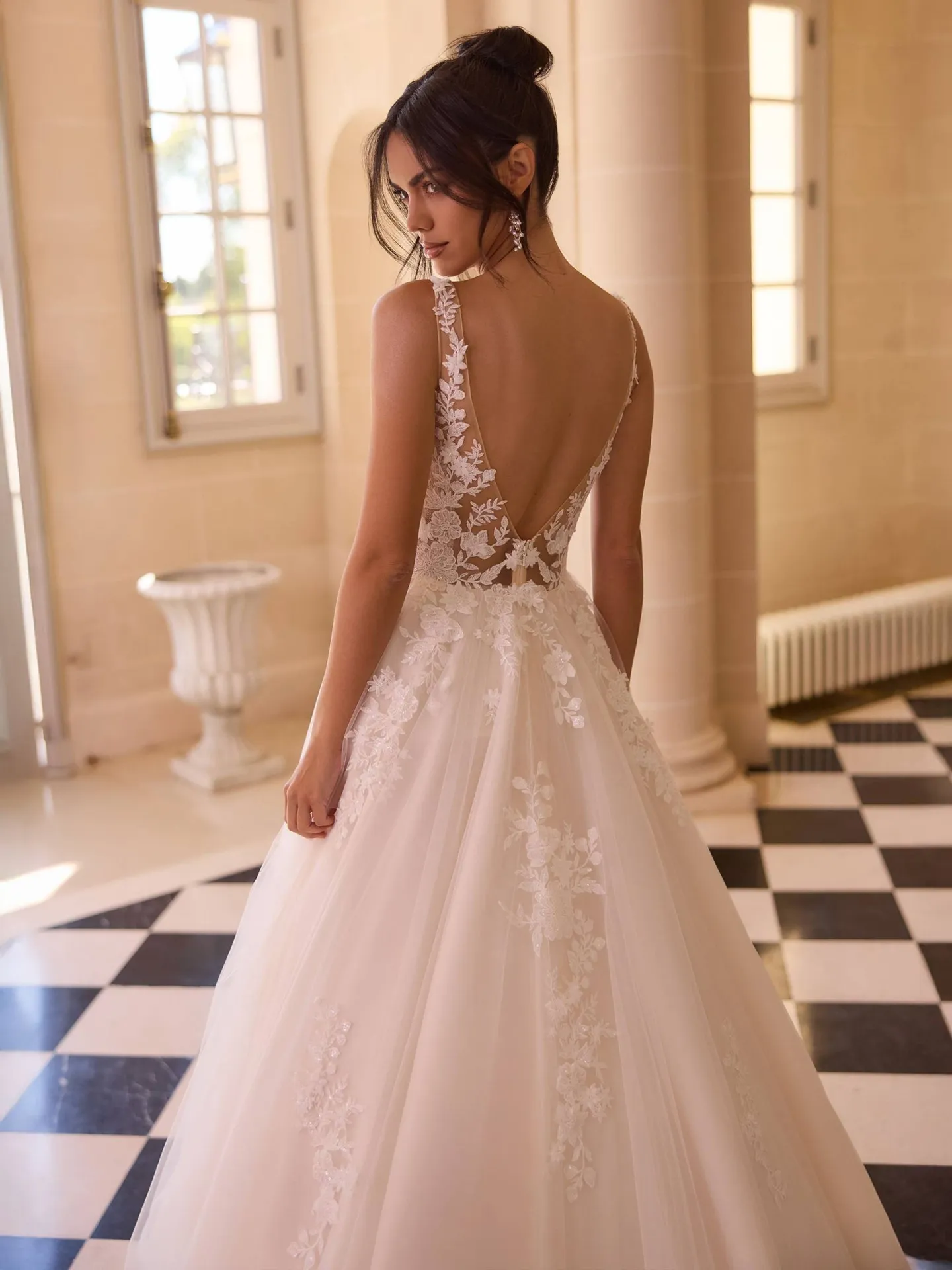 Venez découvrir ce modèle princesse à longue traîne et décolleté élégant, et vivez un moment magique dès le premier essayage.