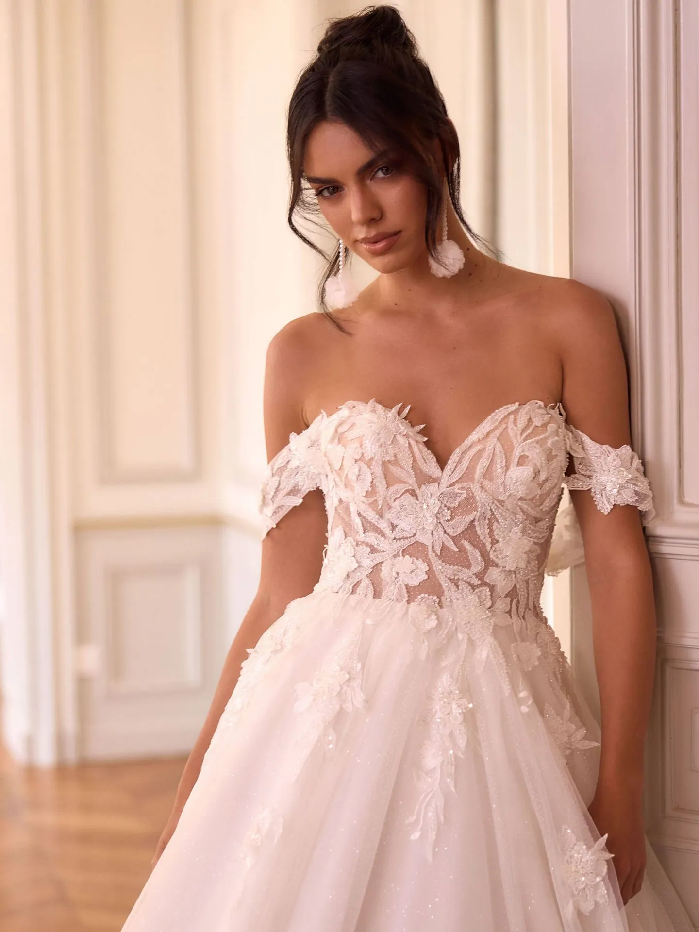 Chez Maelia Mariage, nous croyons que chaque mariée mérite une robe qui lui ressemble. Venez découvrir ce modèle princesse aux manches bateau, et laissez-vous séduire par son élégance naturelle et sa coupe digne des contes de fées.
