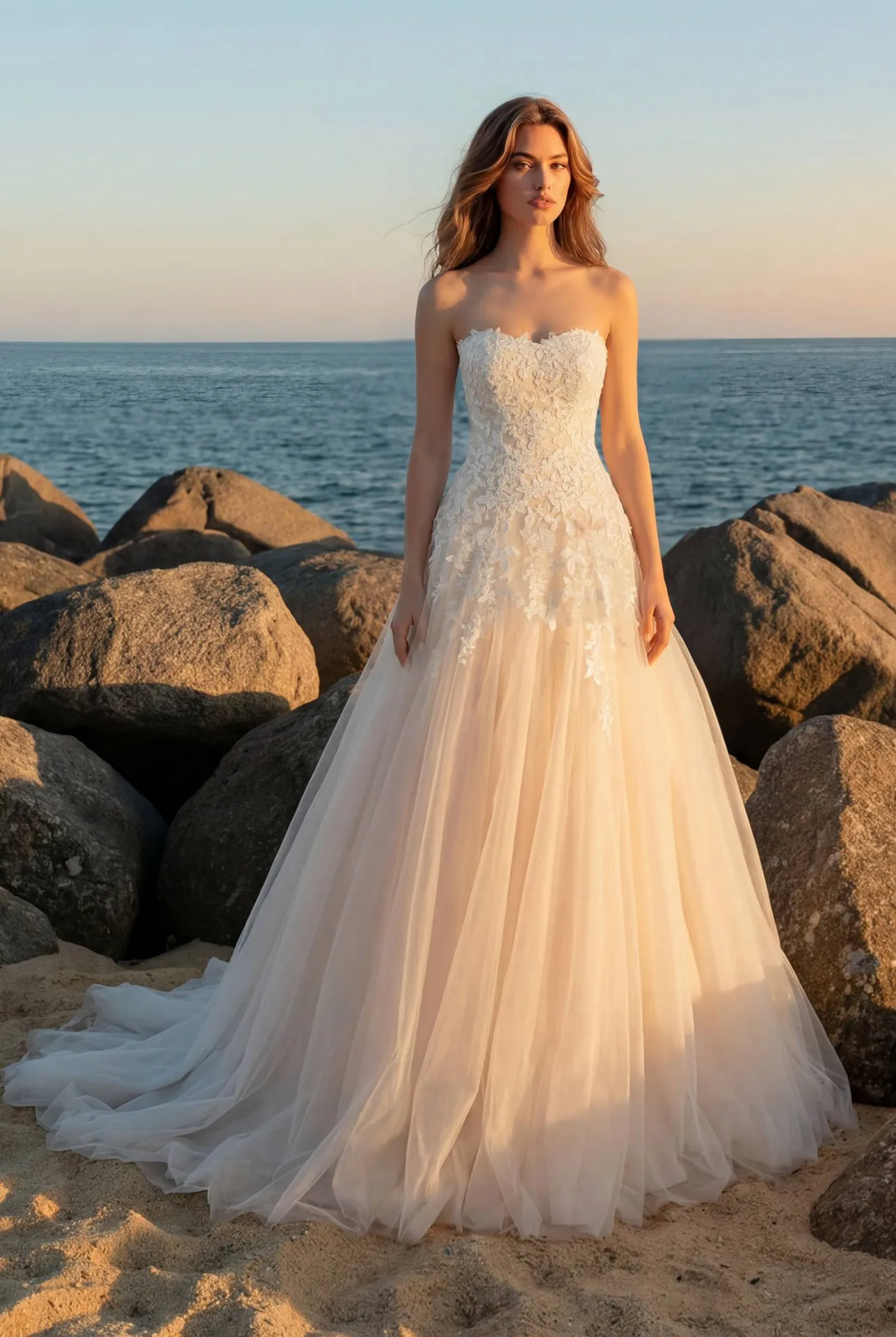 La couleur de la robe est un ivoire doux, légèrement chaud, qui se marie parfaitement avec la lumière naturelle. Cette teinte met en valeur les détails de la dentelle et apporte une dimension romantique supplémentaire. Elle s’adapte particulièrement bien à un cadre extérieur, comme un mariage en bord de mer ou en pleine nature.