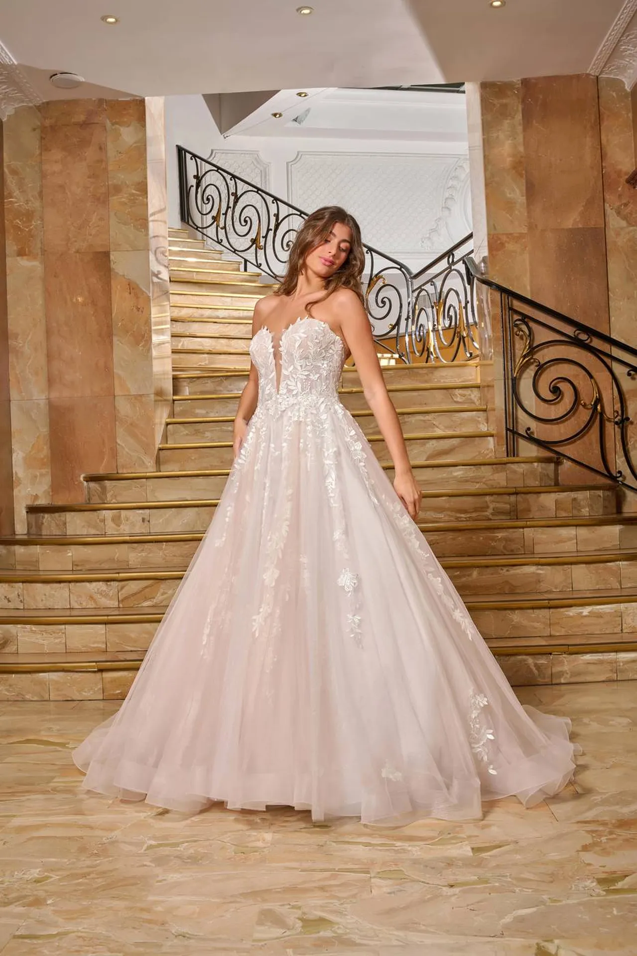Ces robes se distinguent par leur jupe ample et volumineuse, souvent réalisée en tulle, satin ou organza, pour un effet majestueux. Le haut, en forme de bustier, épouse parfaitement le buste, mettant en valeur le décolleté et les épaules avec subtilité. Les finitions soignées, comme les ornements en dentelle, les perles délicates ou les strass scintillants, ajoutent une touche glamour et romantique.
