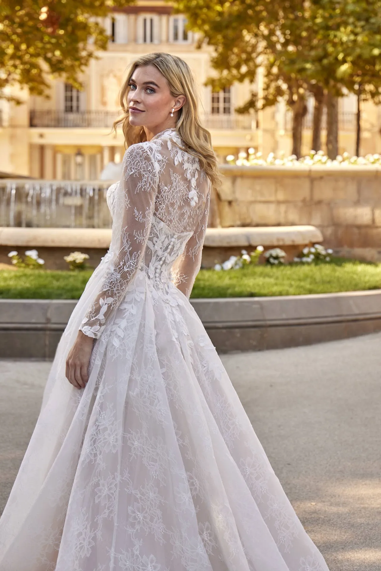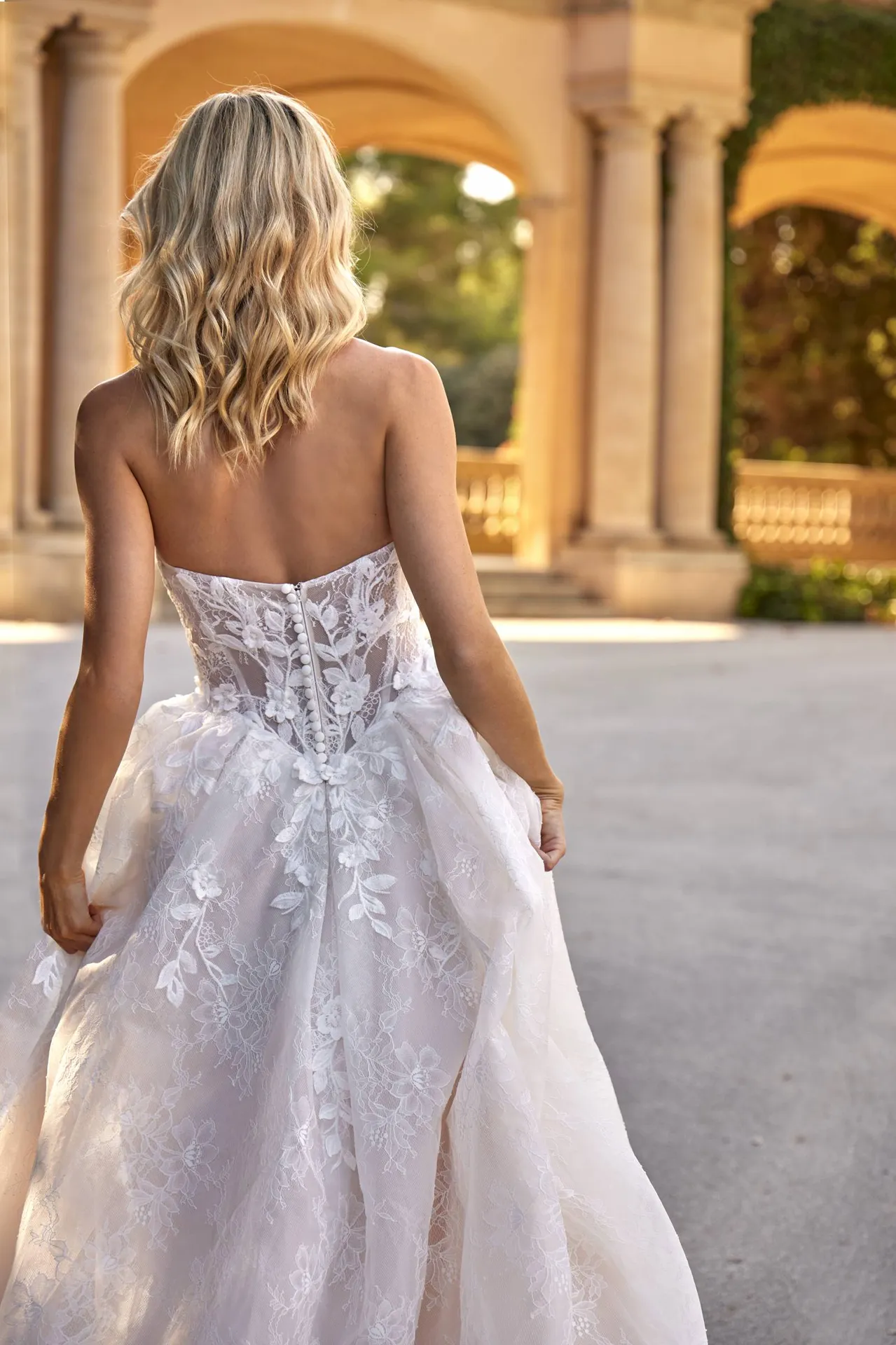 La dentelle se prolonge délicatement sur le haut du dos, créant une continuité visuelle avec le bustier. L’ensemble donne une impression de légèreté et de finesse, tout en mettant en valeur la posture de la mariée.