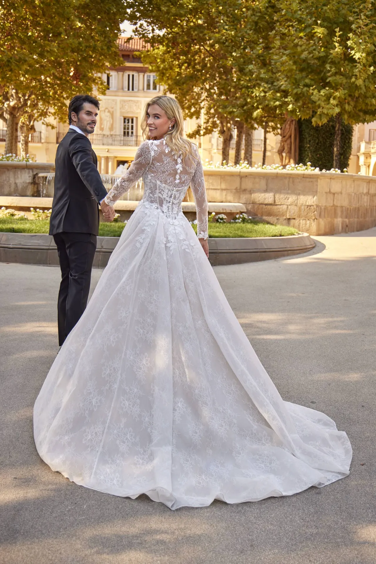 Ce travail du dos est idéal pour sublimer la silhouette sous tous les angles, notamment lors de la cérémonie ou de l’entrée dans l’allée.
