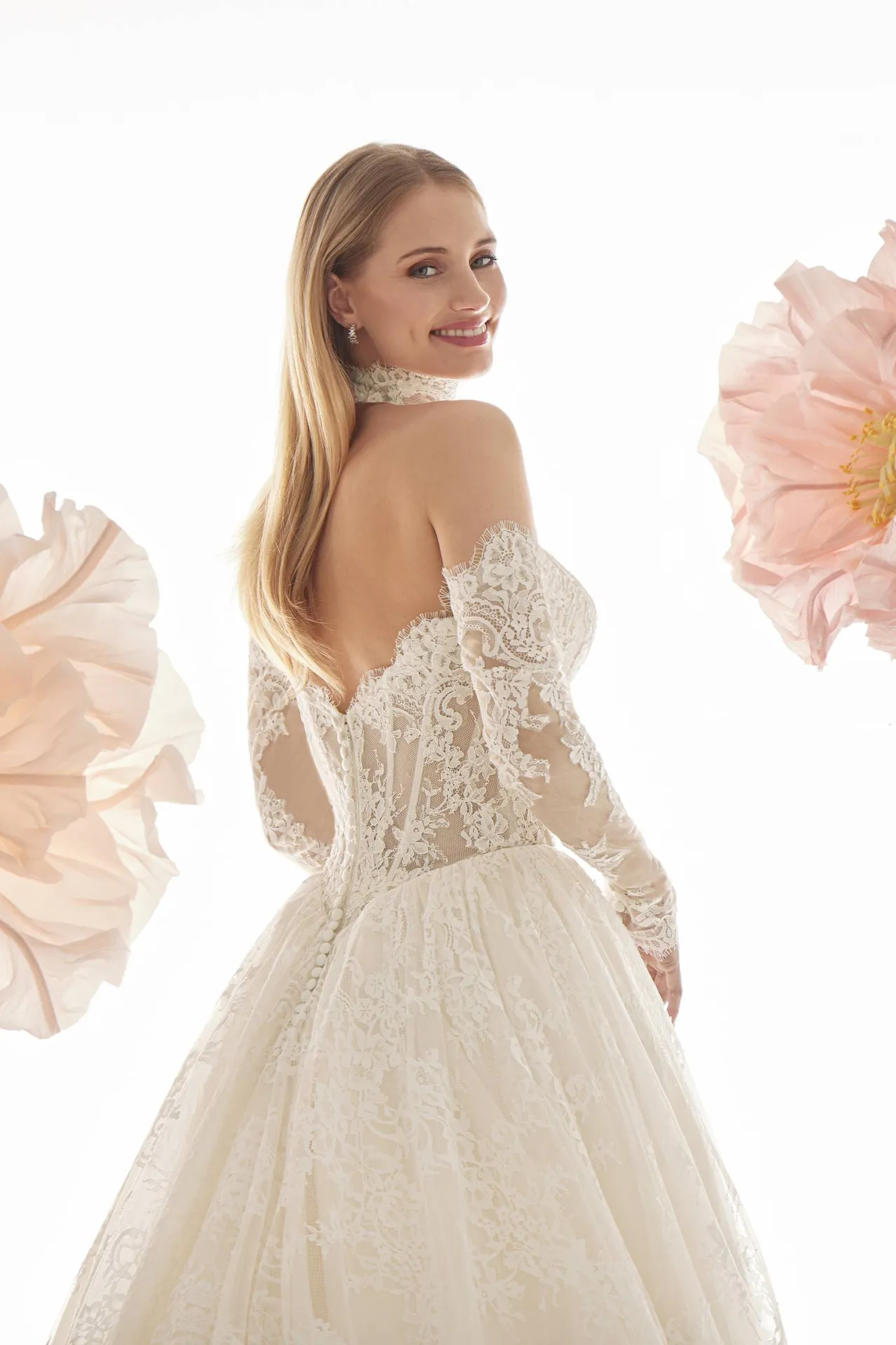 Les manches longues, en dentelle chantilly ou guipure, prolongent l’esthétique raffinée du corsage. Elles sont semi-transparentes et parfaitement ajustées, mettant en valeur la forme du bras et se terminant en bords délicatement festonnés. Le choix de manches longues pour une robe de réception apporte une élégance intemporelle et convient particulièrement aux cérémonies automnales ou hivernales, tout en restant parfaitement adapté à une mariée souhaitant un look sophistiqué et romantique. L’effet est renforcé par un col haut en dentelle, type tour de cou, qui entoure le cou comme un bijou textile : il ajoute une note presque victorienne, raffinée, et encadre joliment le visage.