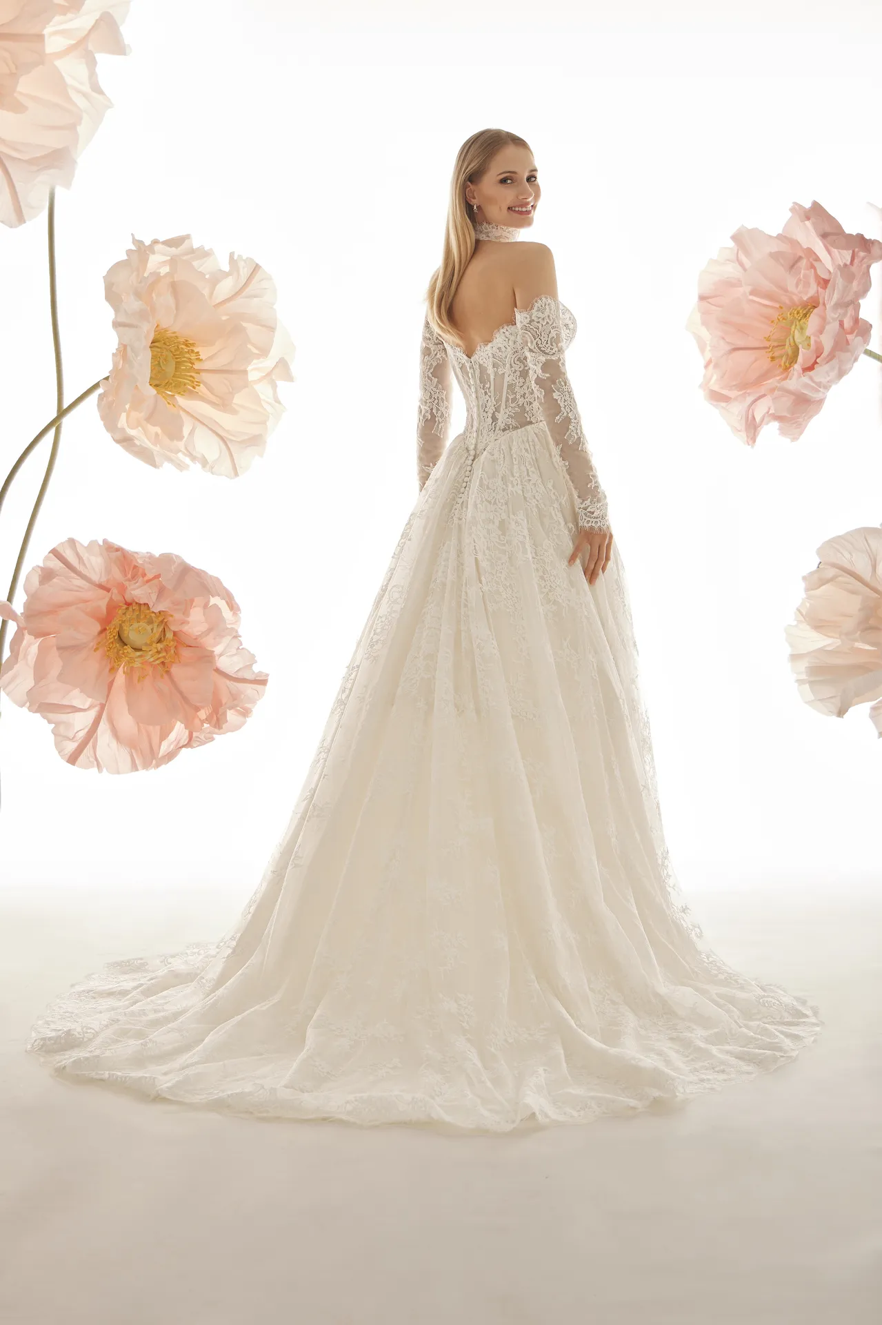 Enfin, sur le plan émotionnel, la robe inspire confiance et grâce : elle souligne la féminité sans l’exposer, elle protège par sa structure tout en laissant transparaître la peau par la dentelle, créant une dualité séduisante entre force et délicatesse. Les détails floraux apportent une dimension organique et intemporelle, tandis que la coupe parfaitement étudiée garantit que la mariée restera la figure centrale de sa journée, captivant le regard à chaque entrée et chaque pas.