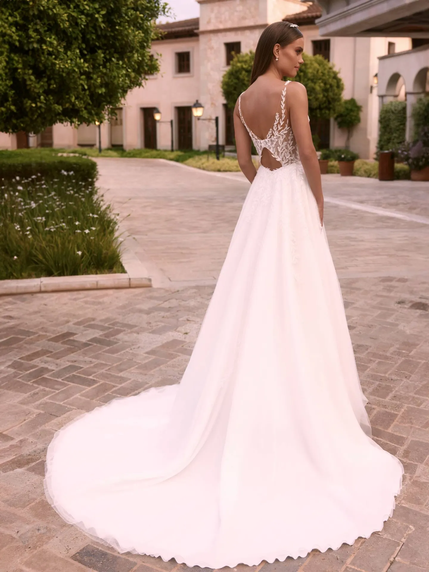 La jupe en tulle, composée de plusieurs couches superposées, crée un volume fluide et vaporeux qui accompagne chacun de vos pas avec légèreté. Elle peut être agrémentée d’une longue traîne pour accentuer l’effet princesse, ou rester plus discrète pour un style plus sobre mais toujours raffiné.