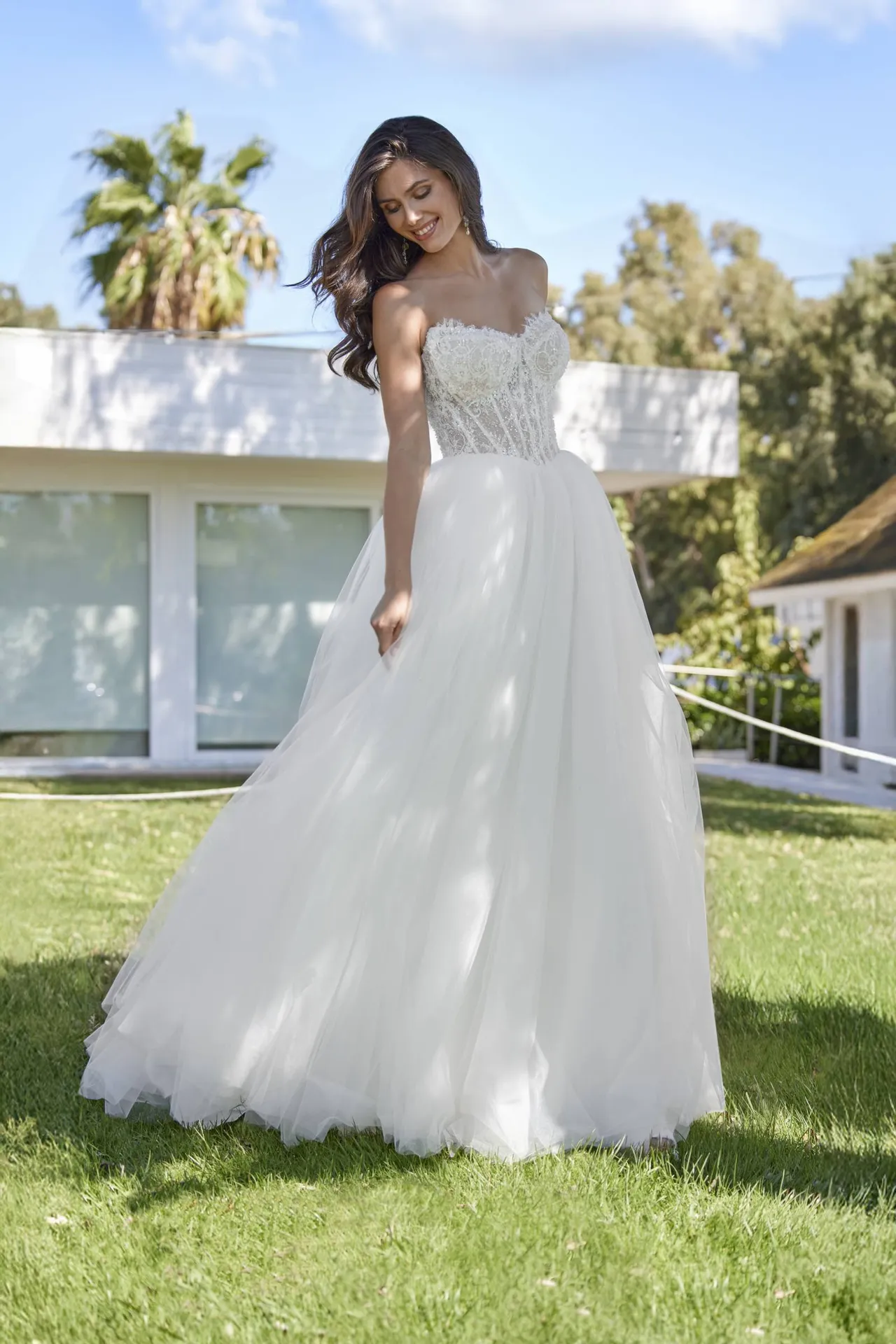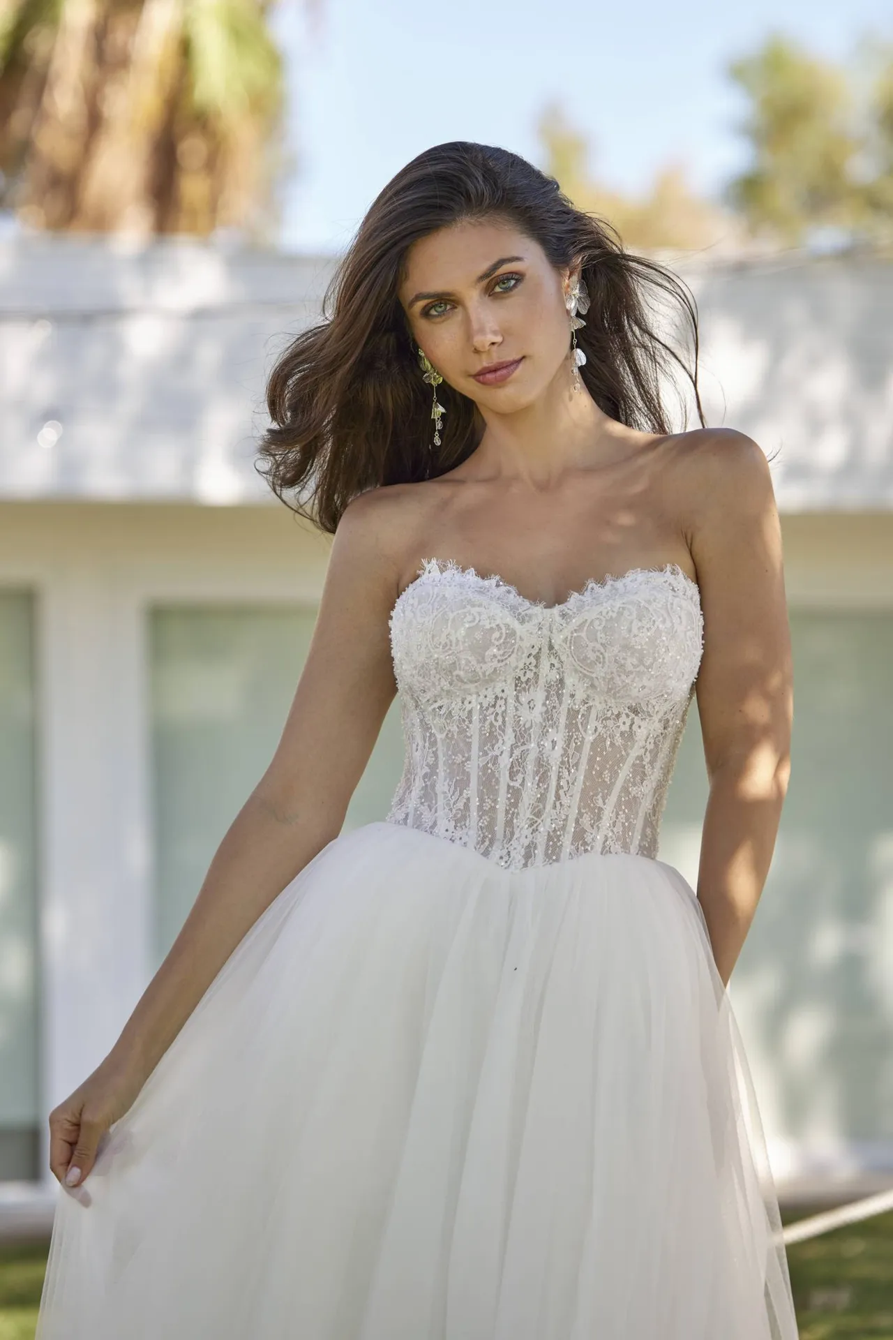 Le corsage structuré est au cœur du design de cette robe. Sa coupe bustier en forme de cœur épouse harmonieusement les courbes du buste, offrant un maintien optimal tout en mettant en valeur le décolleté avec subtilité. Cette ligne douce apporte une féminité assumée tout en conservant une grande délicatesse. Le jeu de transparence, réalisé grâce à un tulle illusion, modernise l’ensemble sans jamais en faire trop. La dentelle florale, appliquée avec précision, semble se poser sur la peau comme un motif délicat, créant un effet visuel à la fois romantique et sophistiqué.