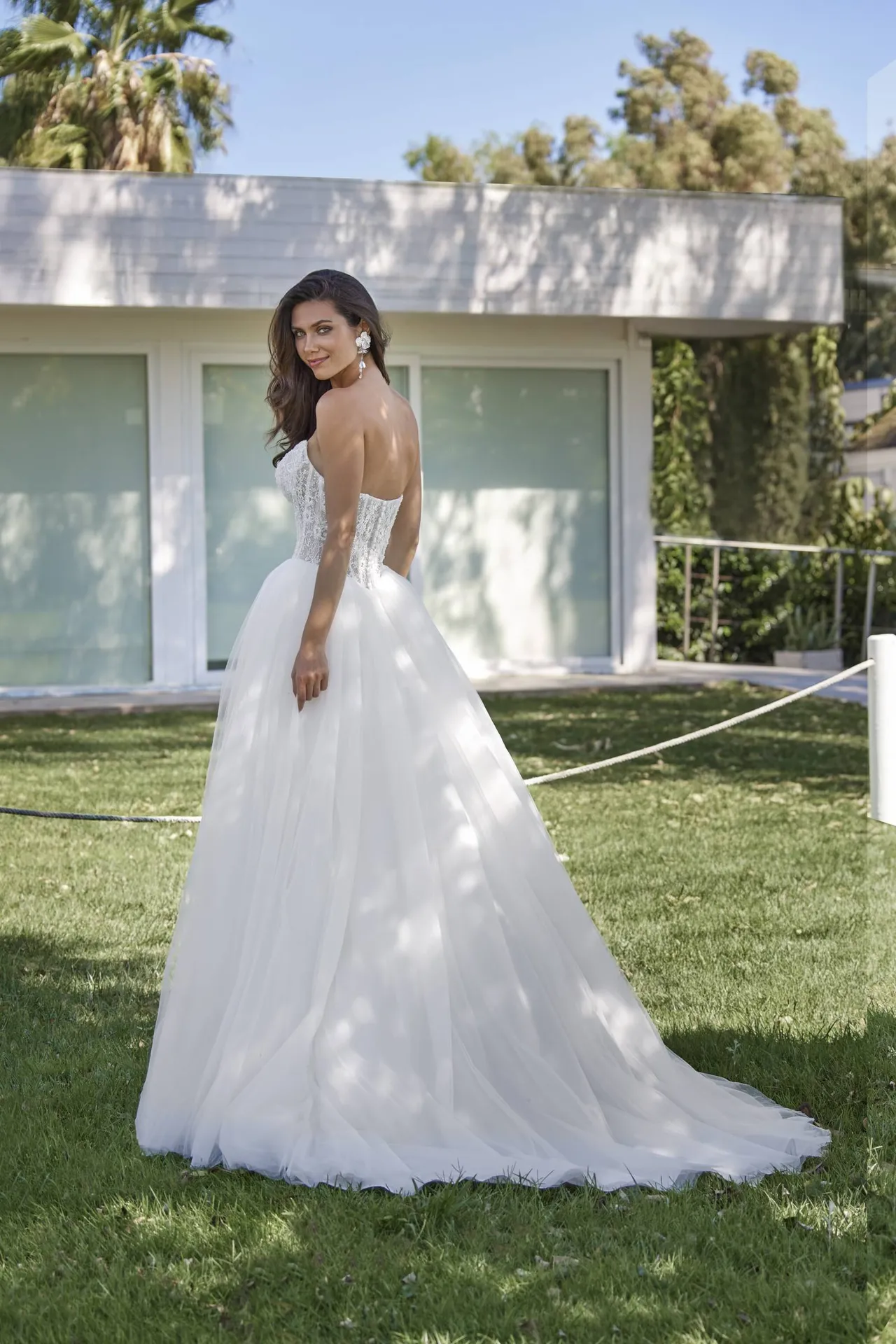 Le dos de la robe reste dans une esthétique sobre et raffinée. Sans ouverture excessive, il mise sur la transparence délicate de la dentelle pour dévoiler subtilement la peau. Ce choix renforce l’élégance globale de la robe, en privilégiant la finesse plutôt que l’audace. Les finitions sont soignées, soulignant la qualité du travail et l’attention portée aux détails.