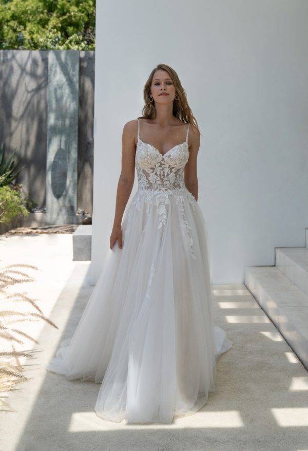 Cette robe de mariée offre une allure à la fois romantique et moderne, pensée pour sublimer la silhouette tout en apportant légèreté et élégance. Son corsage travaillé en transparence délicate est orné de motifs floraux raffinés qui apportent relief et finesse. Les fines bretelles ajoutent une touche de légèreté, permettant un maintien discret tout en valorisant les épaules et le décolleté. La coupe du bustier épouse harmonieusement les courbes, créant une silhouette naturelle et parfaitement équilibrée.