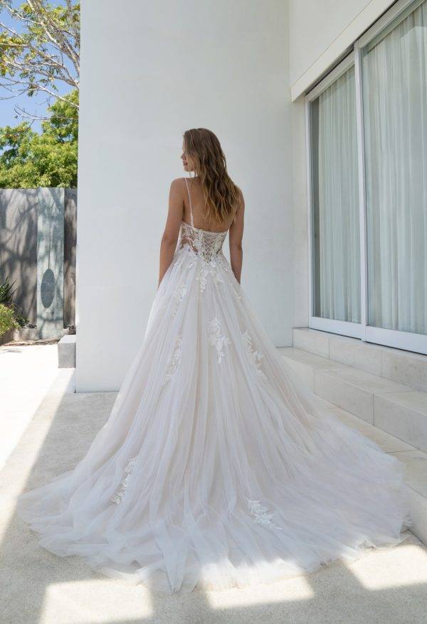 Le dos de la robe attire également le regard par son effet corseté léger et ses détails travaillés avec minutie. La transparence maîtrisée apporte un charme discret, tandis que la traîne délicate accompagne les déplacements avec majesté sans alourdir la silhouette. Elle offre un fini spectaculaire tout en restant facile à porter.
