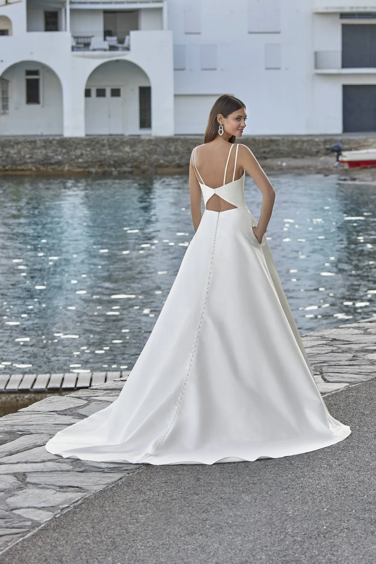 La coupe de la robe est conçue pour sublimer la silhouette de manière naturelle. Ajustée au niveau du buste et légèrement évasée vers le bas, elle suit les formes du corps sans le contraindre. Le satin permet de créer des lignes épurées, fluides et harmonieuses, donnant une allure élégante et élancée. Cette coupe est particulièrement adaptée aux mariées qui recherchent un style contemporain et chic, capable de mettre en valeur la féminité tout en restant confortable.