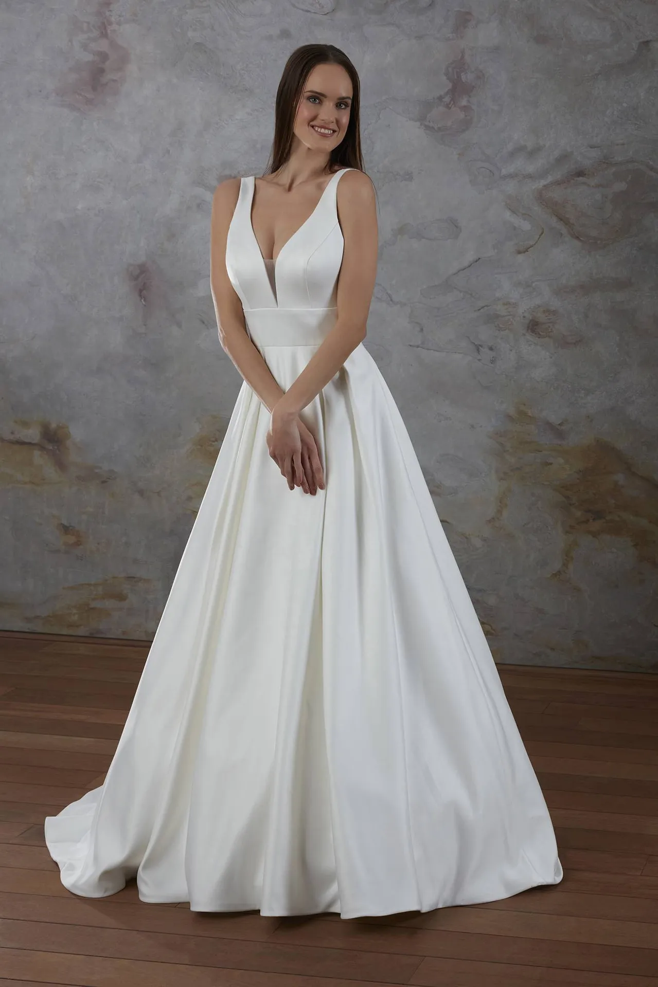 En résumé, une robe de mariée en satin avec un magnifique dos nu marie l'opulence du tissu avec la séduction subtile du dos nu pour créer une robe à la fois élégante et captivante, parfaite pour une mariée qui recherche un équilibre entre luxe et sensualité le jour de son mariage.