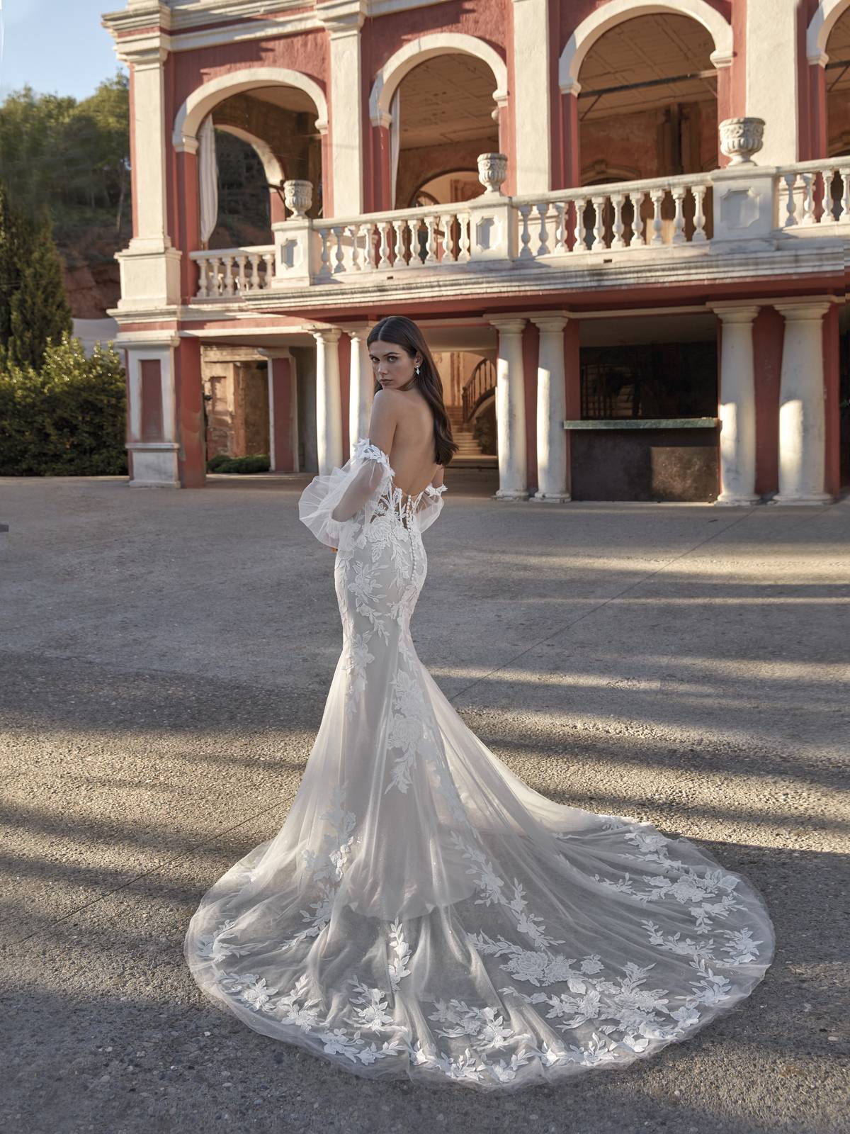 Le col bateau, quant à lui, apporte une note de grâce et d’élégance discrète. En suivant délicatement la ligne des épaules, il dégage le port de tête et le décolleté sans excès, tout en ajoutant une touche de distinction. Ce détail subtil équilibre parfaitement la sensualité de la coupe sirène, offrant un résultat à la fois chic et intemporel.