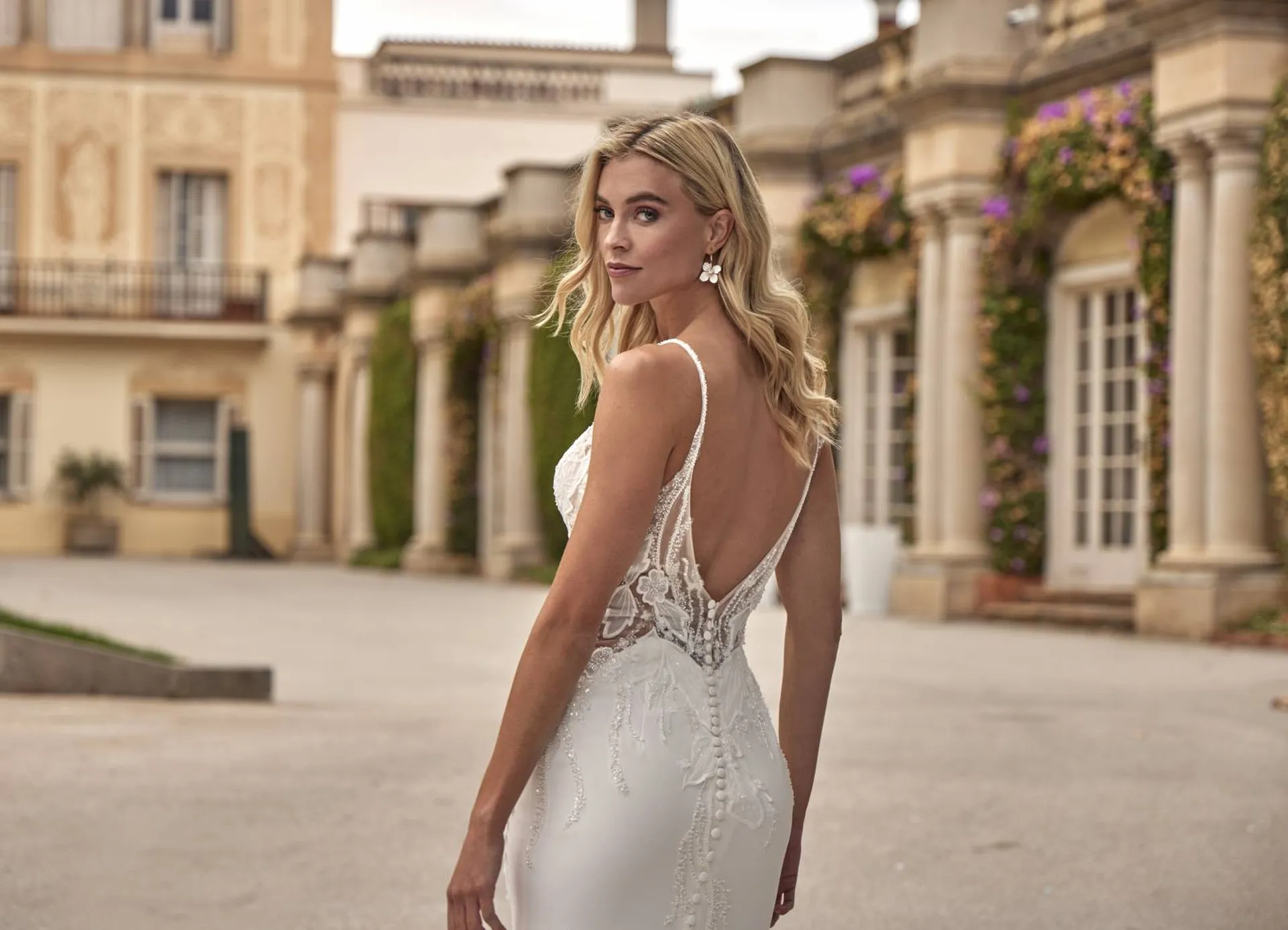 Selon l’angle, on peut apercevoir la continuité des broderies et la fluidité du tissu qui se prolonge jusqu’à la traîne. Ce travail du dos apporte une touche de sophistication supplémentaire, parfaite pour sublimer la silhouette sous tous les angles.