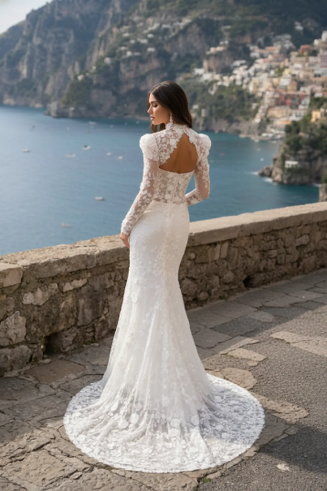 Enfin, cette robe évoque un univers très spécifique : celui d’un mariage raffiné dans un décor méditerranéen, entre mer et falaises, où la lumière naturelle sublime chaque détail. Elle raconte l’histoire d’une mariée moderne, confiante et élégante, qui choisit une robe à la fois spectaculaire et parfaitement équilibrée.